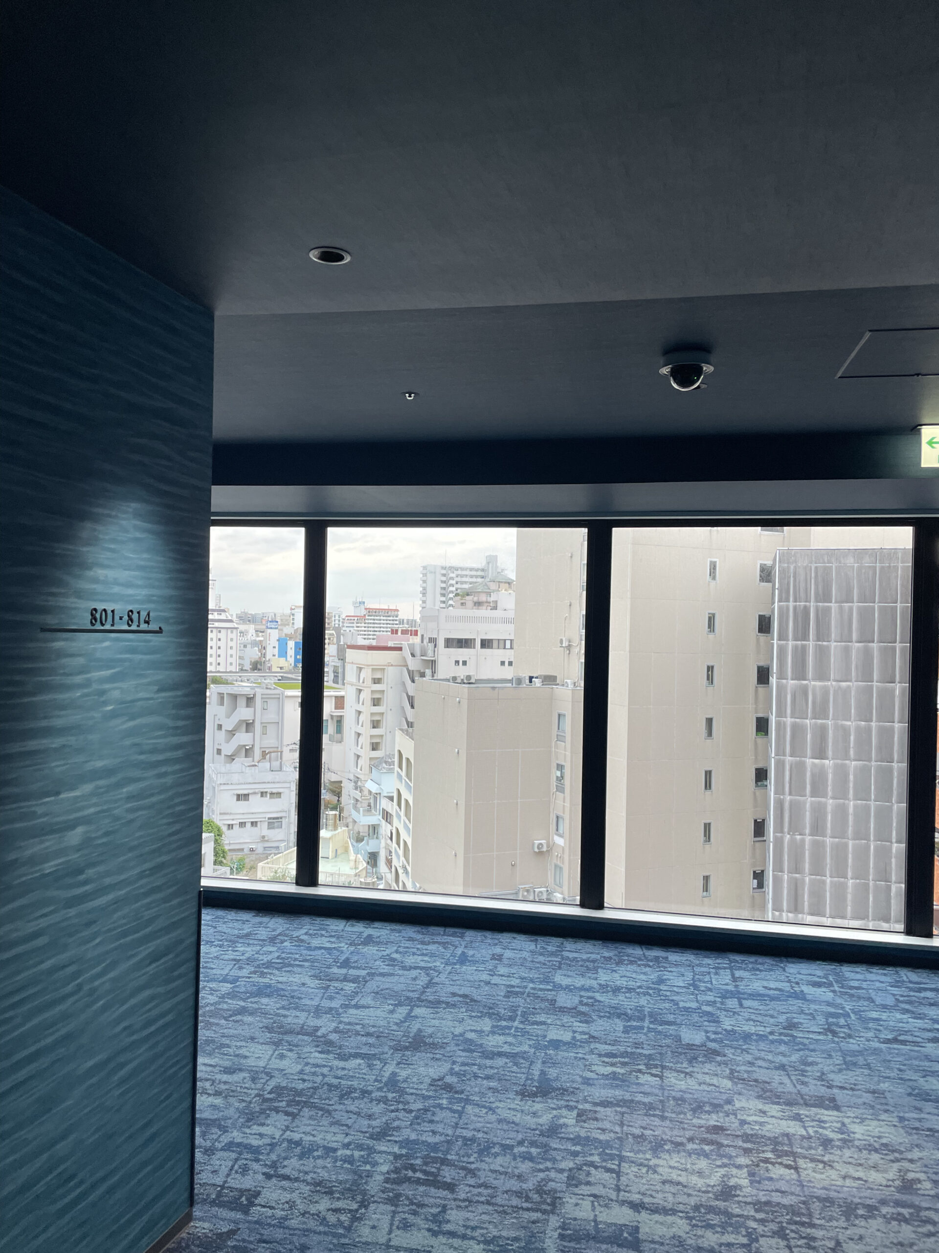 受付を済ませ、エレベーターを降りて自身の部屋のある8Fに降りると青を基調とした高級感がありつつも落ち着く雰囲気の内装に感動します…。