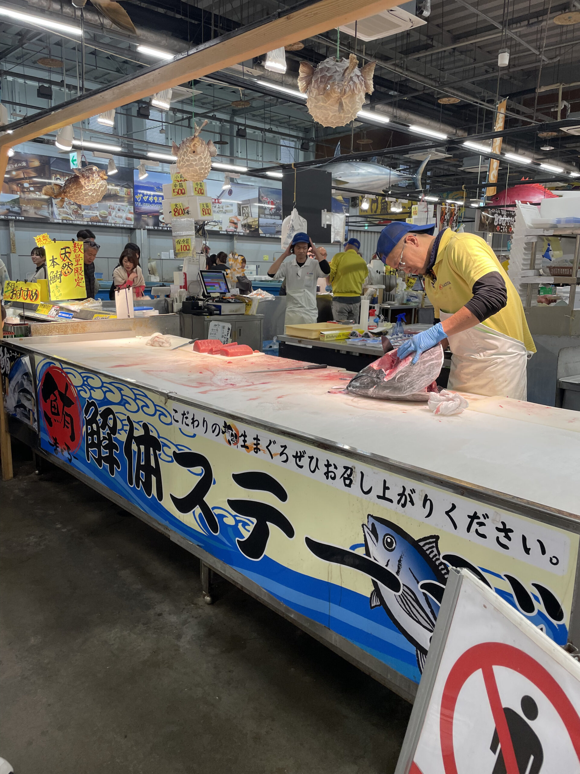 マグロの解体ショーもやっていたりで市場内は大盛り上がり。