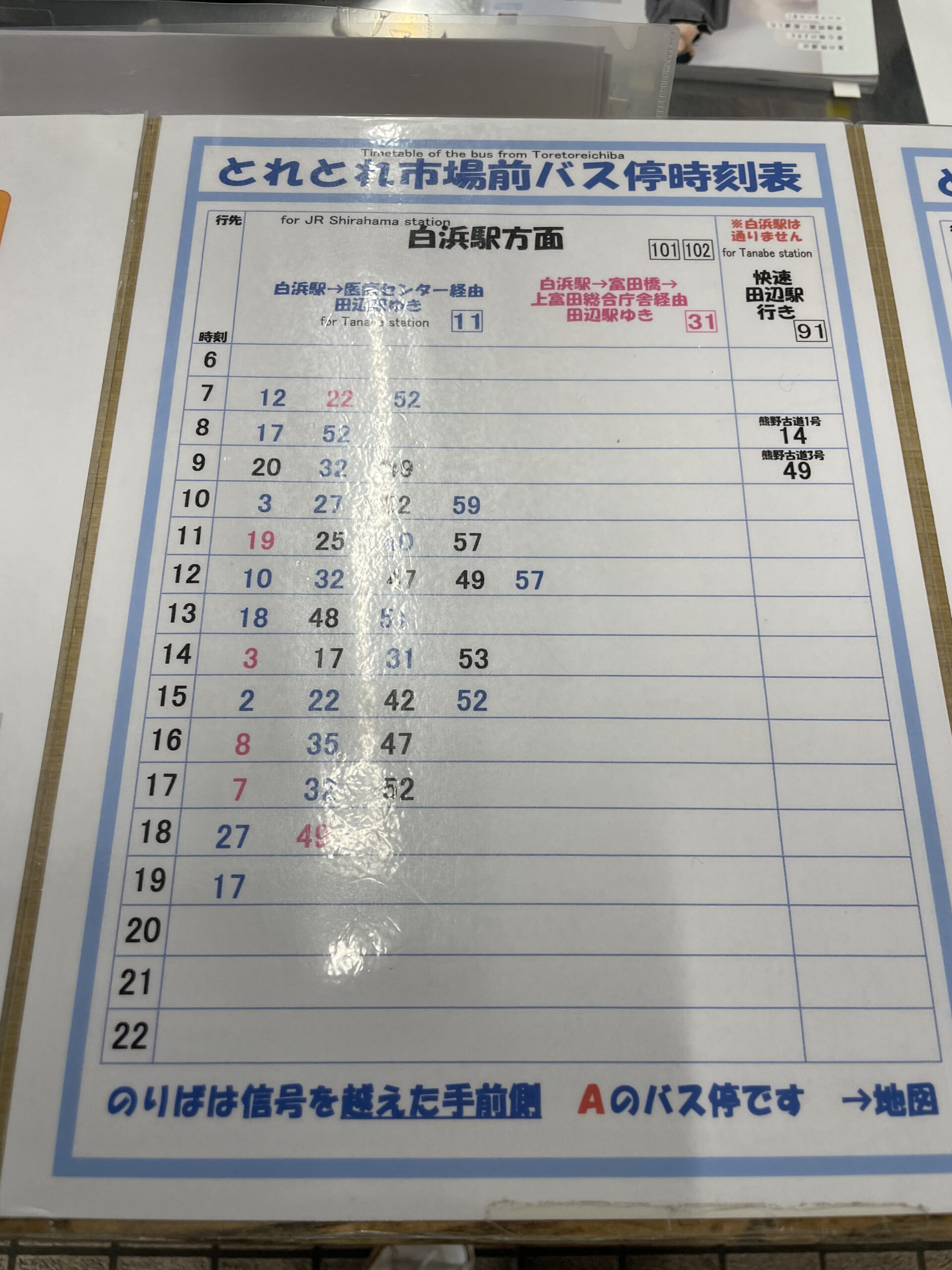 和歌山県白浜町では基本、路線バスかレンタカーを借りて移動するのがベストかと思いますが、筆者は路線バスで周りました。