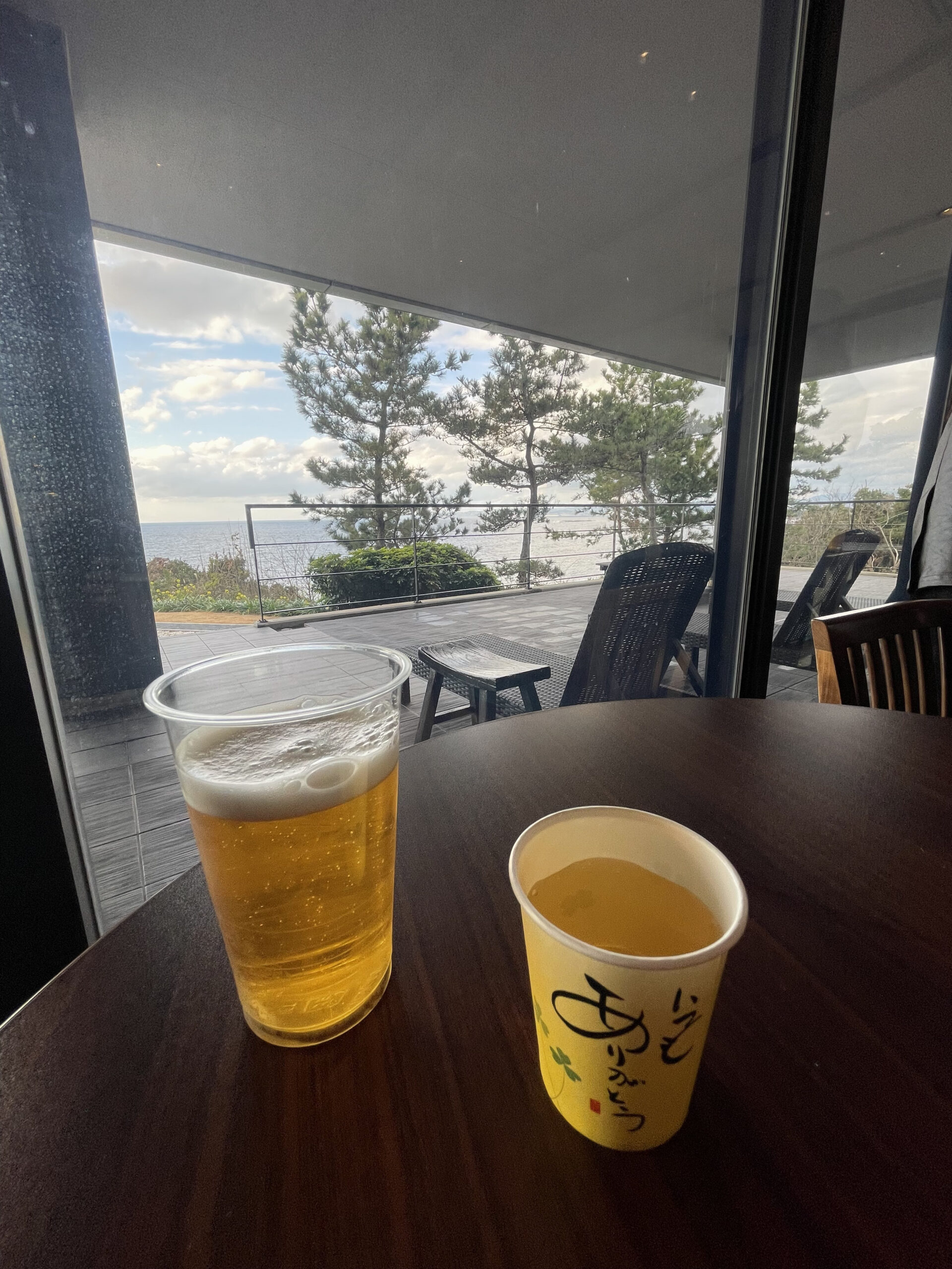 晩御飯まで我慢するつもりが、目の前に広がる太平洋の絶景を前に飲まずにはいられませんでした…。