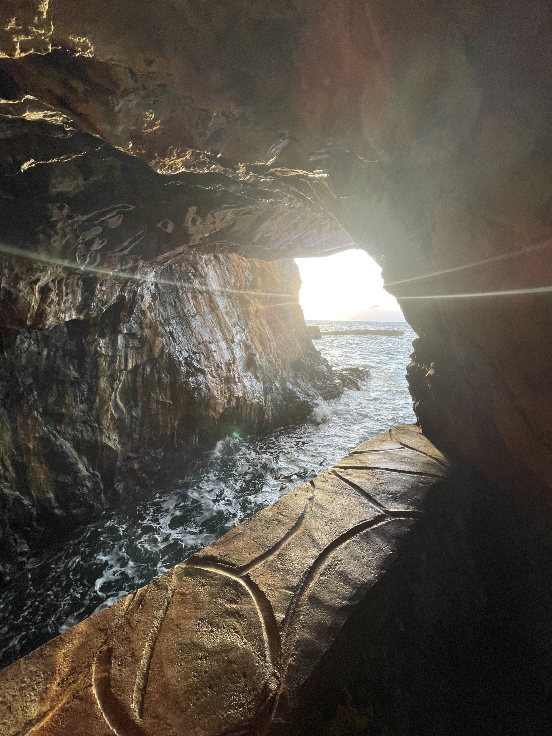 三段壁洞窟の一番の見どころは、こちらの夕日が差し込む景色と打ち寄せる波の迫力だと思いました。