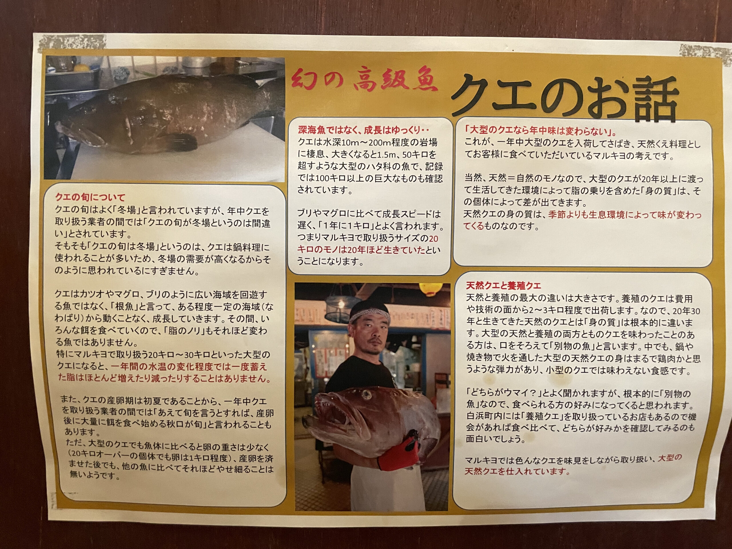 店主さんの「クエのお話」という説明書きもあり、読んだうえで食べるクエはより味わい深いものに感じられます。